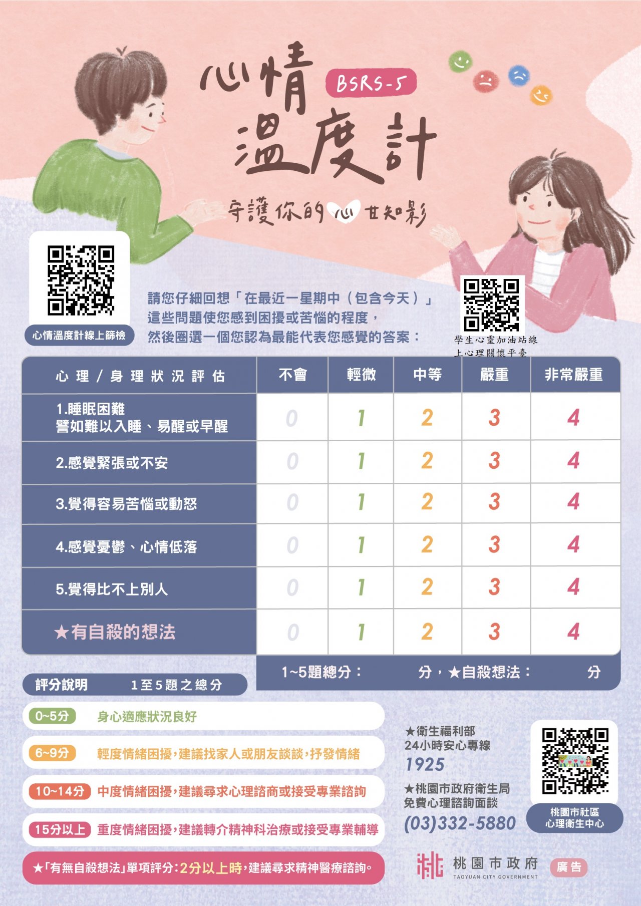 心情溫度計施測結果可供教師或民眾瞭解自己近期的身心狀況,適時運用心理衛生資源及求助專業協助達轉介標準者(總分15 分以上或有自殺想法分數2分以上),後續將由桃園市政府衛生局致電關懷,評估是否持續追蹤或轉介相關單位。篩檢網址(https://forms.gle/5dRpnh1qpXkNaX6x9)