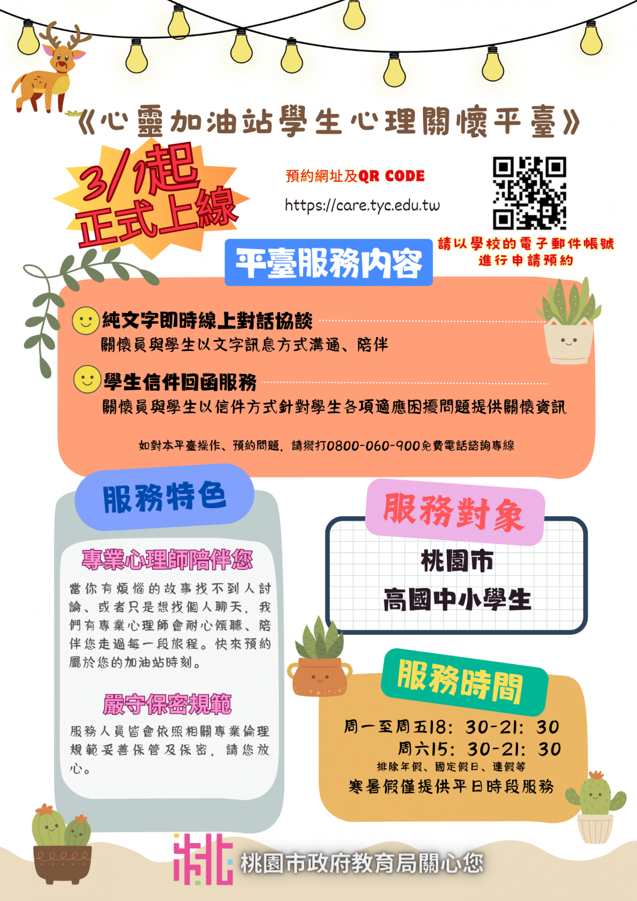 倘學生施測後有心理健康議題諮詢需求,得使用桃園市政府衛生局建置之「心靈加油站學生心理關懷平臺服務項目。(網址:https://care.tyc.edu.tw/)